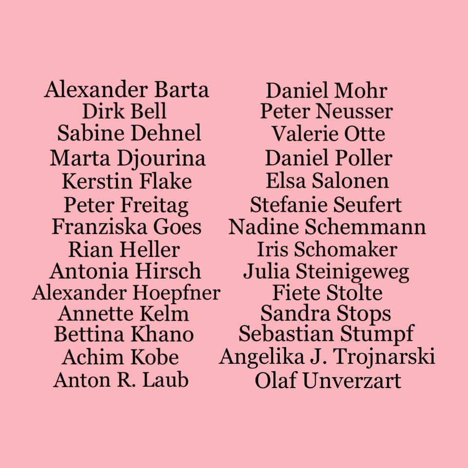 Silke Albrecht, Stefan Bräuniger, Ulrike Buhl, Felix Contzen, Katja Davar, Kerstin Flake, Caroline Hake, Markus Huemer, Achim Mohné, Theresa Möller, Jochen Mühlenbrink, Anna Nero, Stephanie Pech, Jana Thiel, Angelika J. Trojnarski, Francis Zeischegg.
